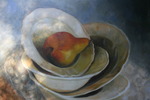 2012Stilleven: gestapelde borden met peer